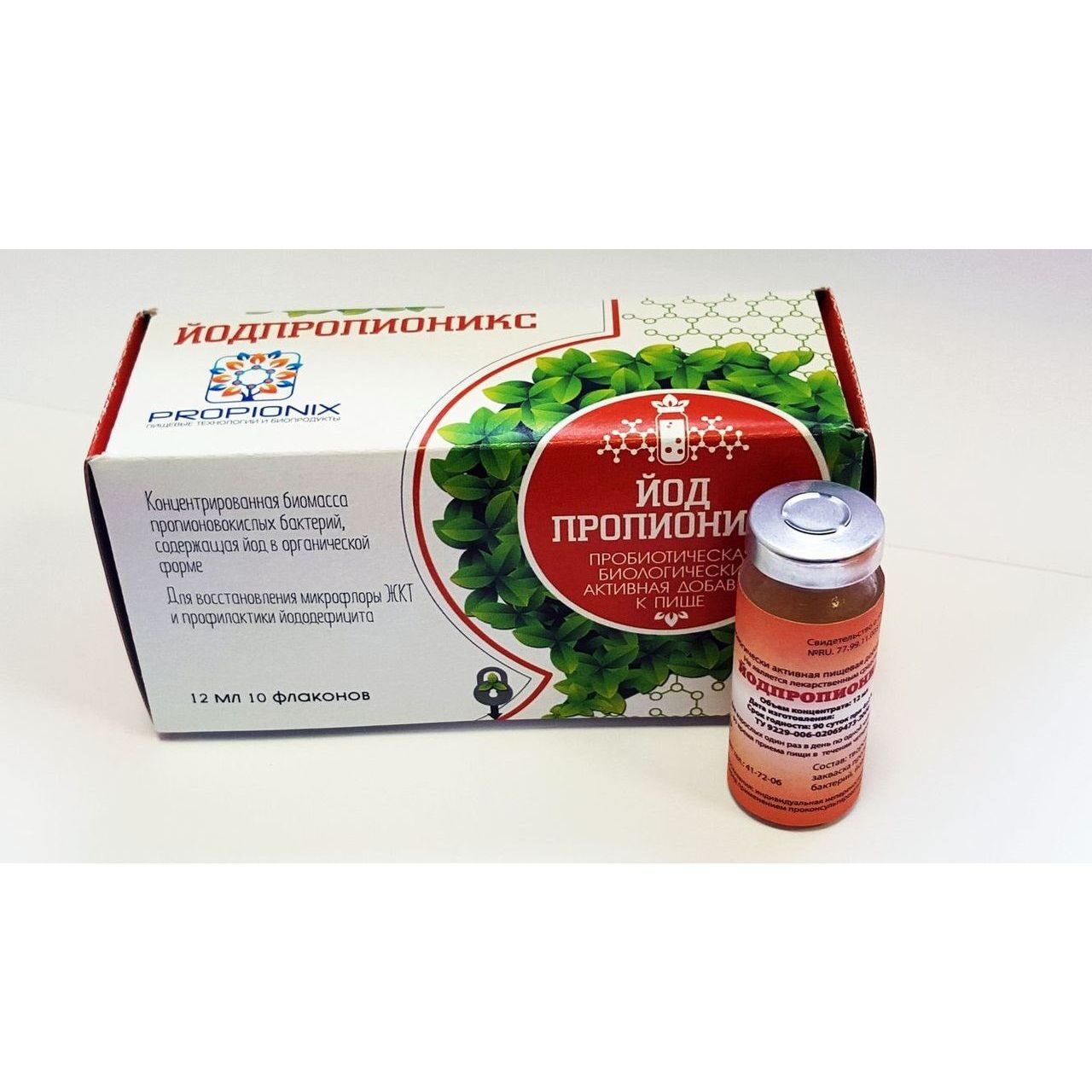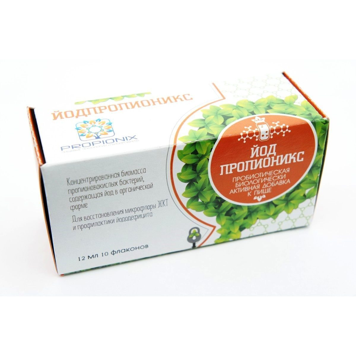 ЙОДПРОПИОНИКС - это инновационный препарат пробиотик, который является продуктом биотехнологического производства и представляет собой концентрированную биомассу пропионовокислых бактерий P. freudenreichii subsp. shermanii – КМ 186, содержащую микроэлемент йод в биодоступной органической форме. Йодпропионикс рекомендован взрослым и детям, особенно школьникам, студентам и беременным женщинам. Йодпропионикс устраняет йододефицит, повышает сопротивляемость организма, улучшает работу желудочно-кишечного тракта, защищает организм от свободных радикалов, мутагенных веществ, поступающих с пищей и вредных воздействий окружающей среды, повышает интеллектуальные способности детей и взрослых. Йодпропионикс, также как и Селенпропионикс, является высококачественной пробиотической закваской пропионибактерий для получения в домашних условиях кисломолочных биопродуктов, обогащенных витаминами группы В (в т.ч. В12 и В9), а также аминокислотами, антиоксидантными ферментами, короткоцепочечными жирными кислотами, экзополисахаридами и др. нутриентами оздоровительного и профилактического свойства.